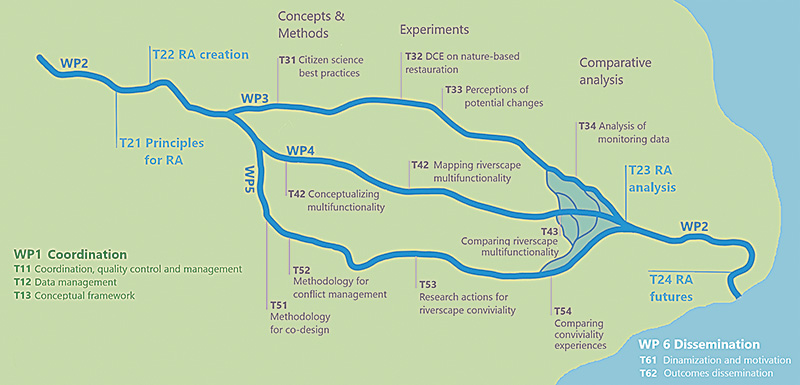 • Desenvolupament teòric: Elaborar el concepte de convivialitat del paisatge fluvial per inspirar la comunitat acadèmica, els professionals i els actors implicats (WP1).